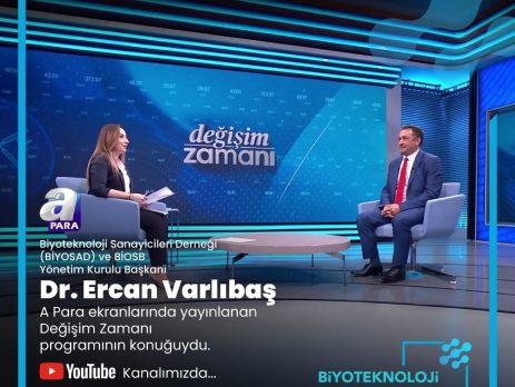 Biyoteknoloji Sanayicileri Derneği (BİYOSAD) ve Biyoteknoloji İhtisas Organize Sanayi Bölgesi (BİOSB) Yönetim Kurulu Başkanımız Dr. Ercan Varlıbaş, A Para ekranlarında yayınlanan ve Dr. Beyhan İncekara’nın sunduğu Değişim Zamanı programına konuk oldu! Türkiye’de Biyoteknoloji Yarıtımları ve Katma Değerli Üretim konuşuldu. Videonun tamamına YouTube kanalımızdan ulaşabilirsiniz.